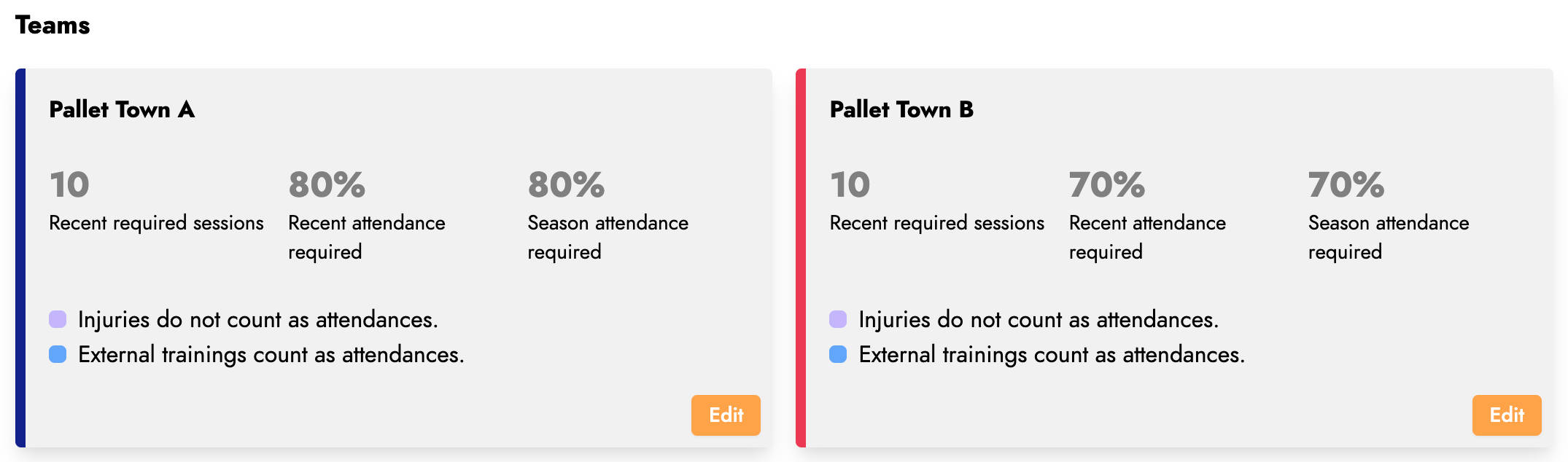 In the second part, you can view the attendance settings of your league's teams and edit them if you have the required permissions.