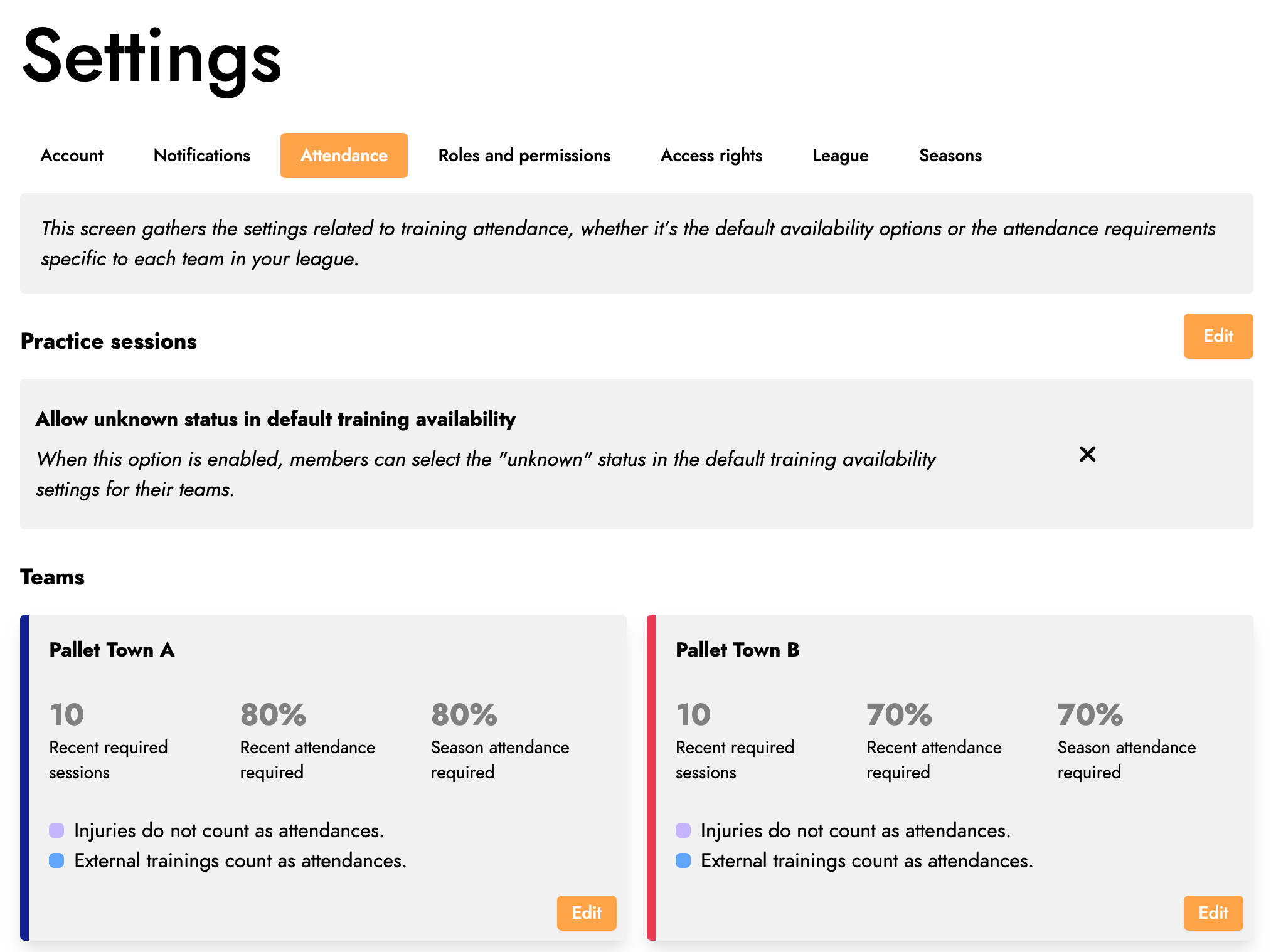 In the settings, you will now find a new "Attendance" tab. This groups several configurations related to practice attendance; on the one hand, enabling the "Unknown" status by default, and on the other hand, configuring the attendance settings for each of your league's teams.