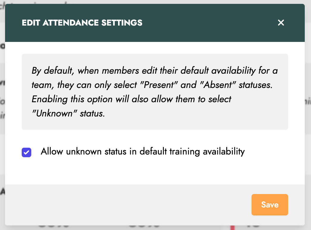 Once enabled, this "Unknown" status will be selectable by members when they edit their default attendance settings for practice sessions.