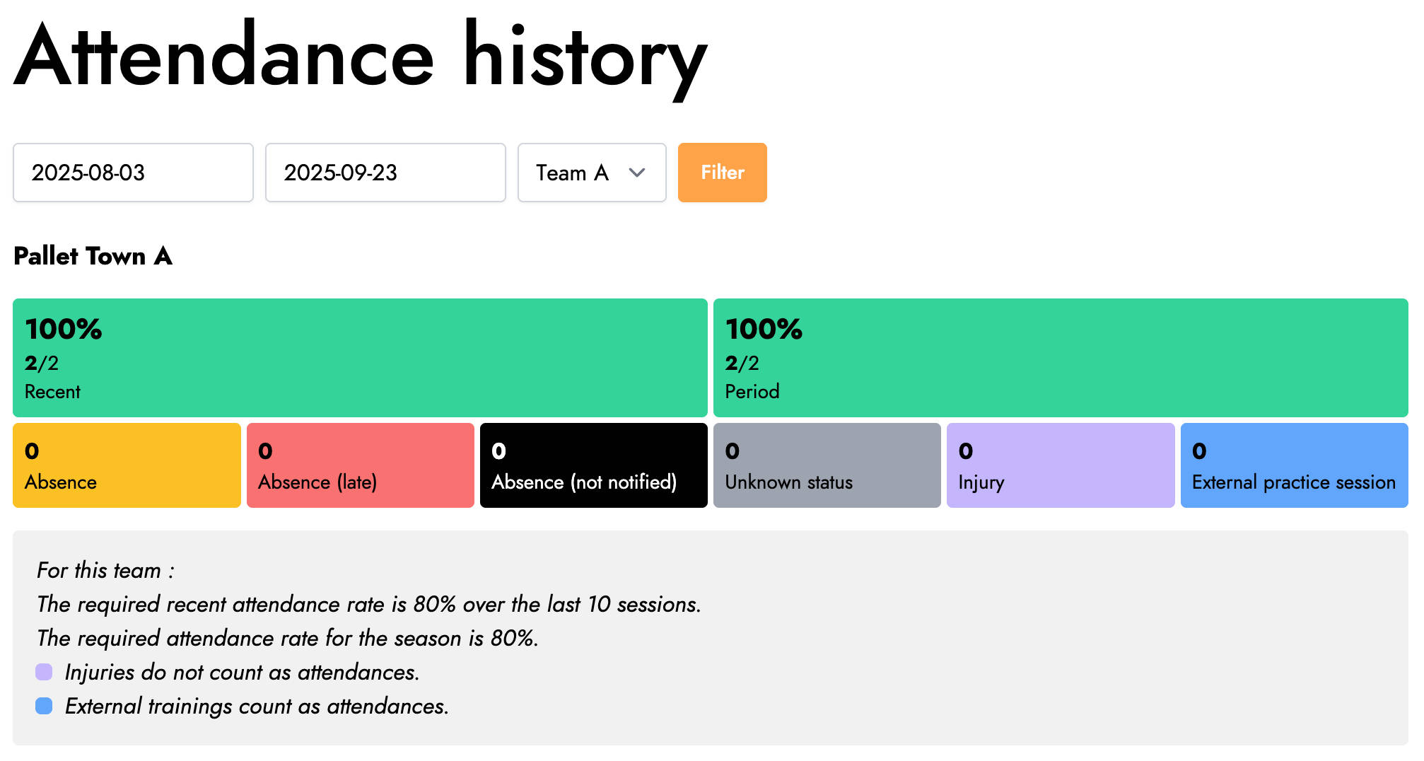 On the full attendance history screen, the display is even more readable and also includes the attendance settings of the selected team.