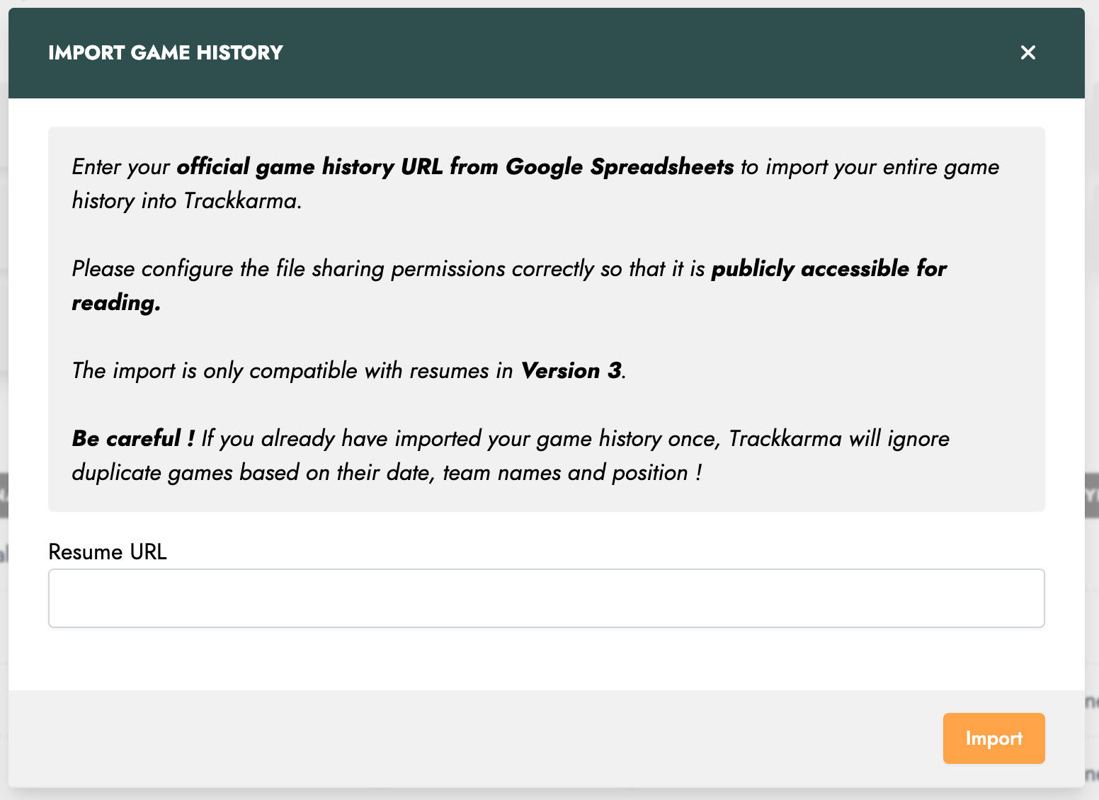 First of all, it is now possible to import your derby CV by directly sharing its URL from Google Spreadsheets. Previously, you had to download the Excel file and re-import it into Trackkarma.